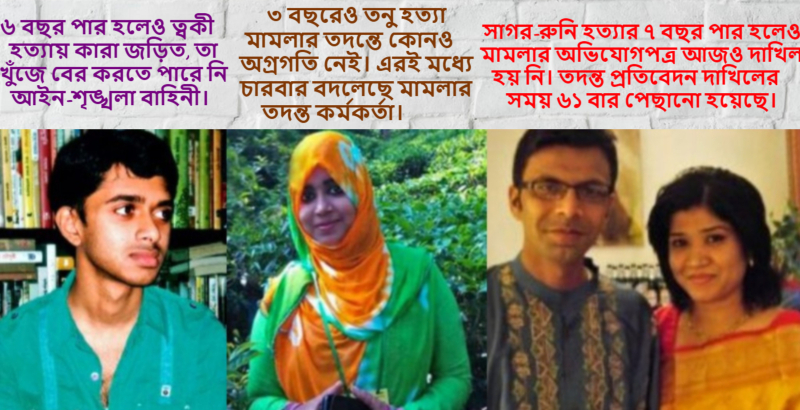সাগর-রুনি, তনু ও ত্বকীর মা-বাবার সঙ্গে কথা বলে এমন হাতাশাজনক চিত্রই মিলেছে। আলোচিত এসব খুনের মামলার অগ্রগতি সম্পর্কে তদন্ত-সংশ্নিষ্টদের সঙ্গে কথা বলে মেলে নি কোনও আশার খবর।