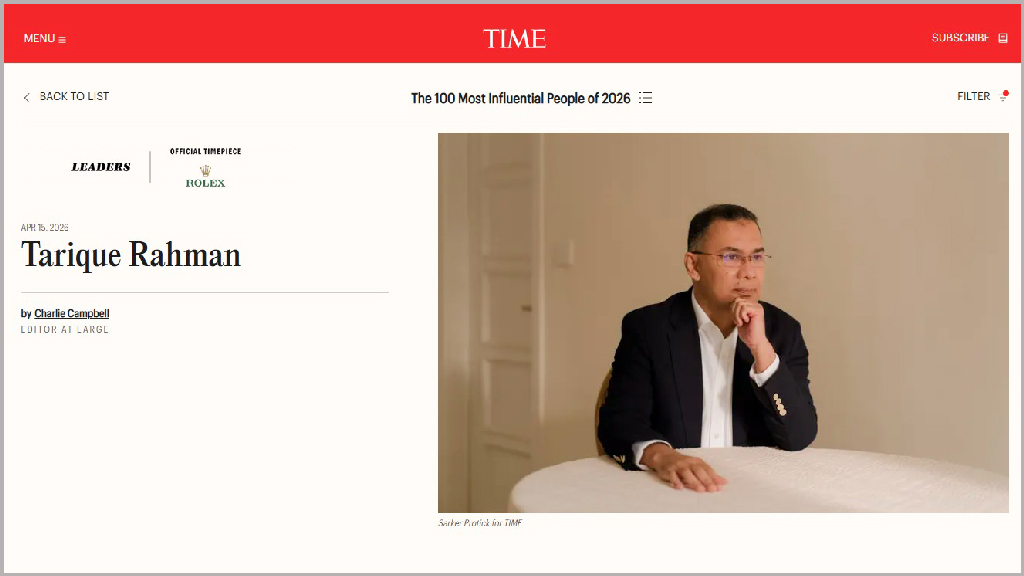 টাইমের প্রতিবেদনে বলা হয়েছে, কয়েক মাস আগেও লন্ডনের দক্ষিণ-পশ্চিমাঞ্চলে নির্বাসিত জীবন কাটাচ্ছিলেন ৫৭ বছর বয়সী তারেক রহমান। কিন্তু ২০২৪ সালে বাংলাদেশের তৎকালীন প্রধানমন্ত্রী শেখ হাসিনার ক্ষমতাচ্যুতি দেশের রাজনৈতিক প্রেক্ষাপটে বড় পরিবর্তন আনে। সেই প্রেক্ষাপটে বিরোধী আন্দোলনের মুখ থেকে তিনি দ্রুত জাতীয় নেতৃত্বের কেন্দ্রে উঠে আসেন।