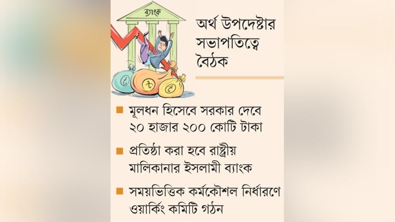 এক্সিম, সোশ্যাল ইসলামী, ফার্স্ট সিকিউরিটি ইসলামী, গ্লোবাল ইসলামী ও ইউনিয়ন ব্যাংক মিলে একটি ব্যাংক প্রতিষ্ঠার রূপরেখার খসড়া নিয়ে গতকাল রোববার অর্থ উপদেষ্টা ড. সালেহউদ্দিন আহমেদের সভাপতিত্বে বৈঠকে এসব সিদ্ধান্ত হয়। অর্থ মন্ত্রণালয়ের সভাকক্ষে অনুষ্ঠিত এ বৈঠকে প্রধান উপদেষ্টার বিশেষ সহকারী ড. আনিসুজ্জামান চৌধুরী, অর্থ সচিব ড. মো. খায়েরুজ্জামান মজুমদার, জাতীয় রাজস্ব বোর্ডের চেয়ারম্যান আবদুর রহমান খান, আর্থিক প্রতিষ্ঠান বিভাগের সচিব নাজমা মোবারেক, বাংলাদেশ ব্যাংকের ডেপুটি গভর্নর ড. মো. কবির আহম্মদসহ অর্থ মন্ত্রণালয় ও বাংলাদেশ ব্যাংকের ঊর্ধ্বতন কর্মকর্তারা উপস্থিত ছিলেন। বৈঠকে অনলাইনে যুক্ত ছিলেন বাংলাদেশ ব্যাংকের গভর্নর ড. আহসান এইচ মনসুর।