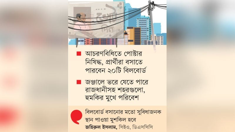 জাতীয় সংসদ নির্বাচন উপলক্ষে গত ১০ নভেম্বর আচরণ বিধিমালার গেজেট প্রকাশ করে নির্বাচন কমিশন (ইসি)। এর ৭ (ক) ধারায় বলা হয়, নির্বাচনী প্রচারে কোনো প্রকার পোস্টার ব্যবহার করা যাবে না। আর ১৪ (ক) ধারায় বলা হয়, নির্বাচনী প্রচারণার ক্ষেত্রে যে কোনো ধরনের বিলবোর্ড ব্যবহার করা যাবে। ‘খ’ ধারায় উল্লেখ করা হয়, একজন প্রার্থী ২০টির বেশি বিলবোর্ড ব্যবহার করতে পারবেন না।