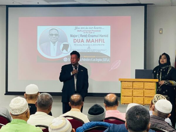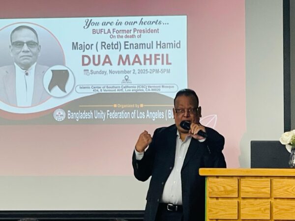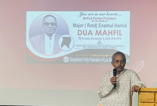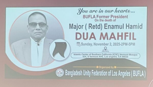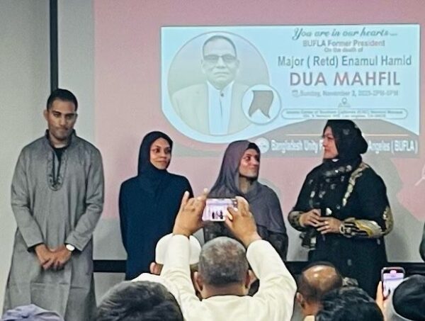 আতাউল খান (রিপন) হলিউড থেকে: গত ২ নভেম্বর ২০২৫ রবিবার যথাযথ মর্যাদা স্রোধ‍্যা ও সম্মানের সঙ্গে অনুষ্ঠিত হলো মরহুম মেজর (অব.) এনামুল হামিদের দোয়া এবং স্মরণ সভা । অনুষ্ঠানটি আয়োজন করে বাংলাদেশ ইউনিটি ফেডারেশন অব লস এজ্ঞেলেস (বাফলা)। মরহুম এনামূল হামিদ বাফলার সাবেক প্রেসিডেন্ট ছিলেন এবং তিনি গত ই অক্টোবর ২০২৫ অসুস্থতা জনিত কারণে ইন্তেকাল করেন (ইন্নালিল্লাহি ওয়া ইন্না ইলাইহি রাজিউন)। অনুষ্ঠানে উপস্থিত ছিলেন তার পরিবারের সদস্যবৃন্দ এবং বাফলার সাবেক ও বর্তমান নেতৃবৃন্দ সহ লস এঞ্জেলস ও পার্শ্ববর্তী এলাকার বিশিষ্ট গণ্যমান্য ব্যক্তিবর্গ । সবাই তার আত্মার মাগফেরাত কামনা করেন এবং শোকসন্তপ্ত পরিবারের সদস্যদের প্রতি আন্তরিক সমবেদনা জ্ঞাপন করেন।